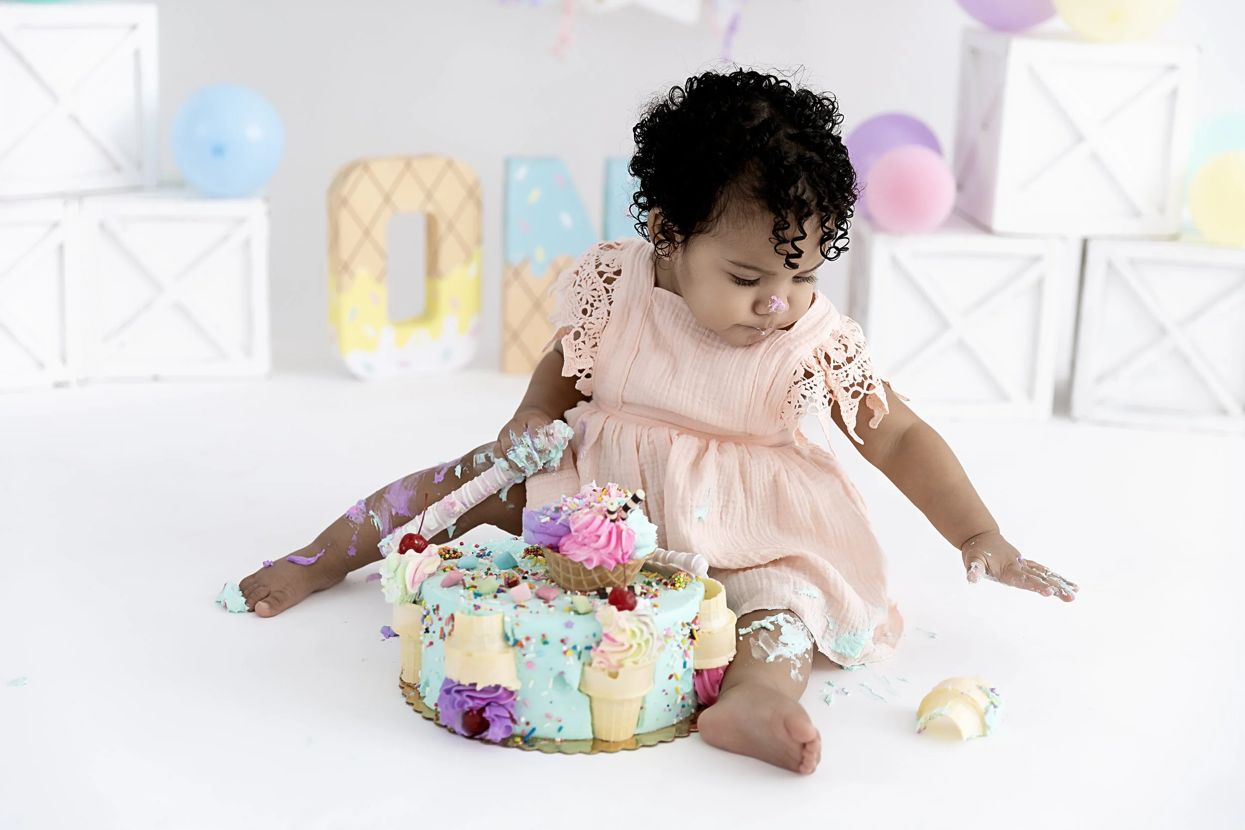 Mylah is sweetest baby around and her mama says “You have creative freedom, do your thing.” I of course had to go all out with the most “extra” cake smash I’ve ever done! We did the theme Sweet One as a play on her sweet vibe, but also because she LOVES to eat!